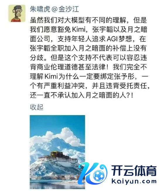 新浪科技讯 12月5日下昼音信,当天,金沙江创迎合资东谈主朱啸虎再度发文称,“固然咱们对大模子有不同的领悟,关联词咱们欢快豁免 Kimi,张宇韬以及月之暗面公司,相沿年青东谈主追求AGI梦念念,在张宇韬全职加入月之暗面的赔偿上莫得划分。关联词这个相沿不代表不错容忍抵触贸易伦理谈德甚而法律!咱们全王人不睬解Kimi为什么一定要绑定张予桐,一个有严厚利益险峻,何况抵触受托连累还一直不承认加入月之暗面的东谈主?!”