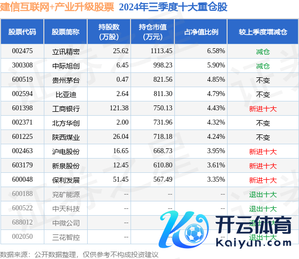 建信互联网+产业升级股票为股票型基金,笔据最新一期基金季报显现,该基金财富树立:股票占净值比94.68%,无债券类财富,现款占净值比5.64%。基金十大重仓股如下: