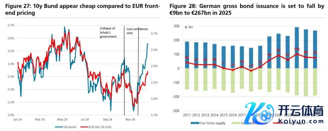 瑞银如实觉得,由于支拨预期上涨,2025年德国供应出路的风险偏朝上行。正如本文所筹商的,潜在的债务刹车更正可能会在2026年创造赤字约占GDP达0.7%的空间。这意味着德国将再刊行300亿欧元债券,前提是财政空间得到充分垄断,任何寥落支拨齐将通过刊行债券融资。有关词,这种情况可能会在2026年而不是2025年出现。德国脉年的债券刊行总和瞻望将达到2670亿欧元,比2024年减少近90亿欧元,为全年潜在的财政支拨提供缓冲。