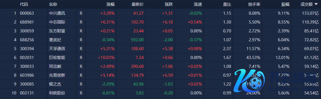 个股方面,中兴通讯成交额居首,为133.07亿元。其次是中芯海外、东方金钱、寒武纪、天孚通讯,成交额诀别为110.39亿元、85.41亿元、72.82亿元、69.07亿元。