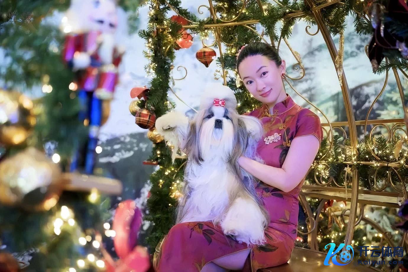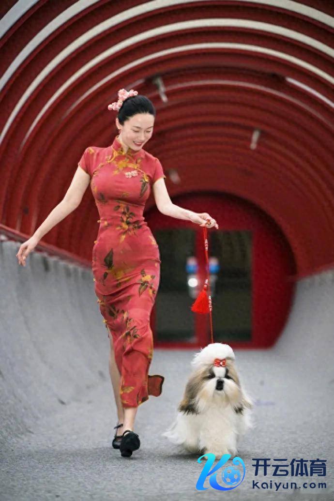 霍想燕穿沉寂亮眼的红旗袍,狗狗颈间系着同款红蝴蝶结,一通盘登第搭配又好意思又飒。