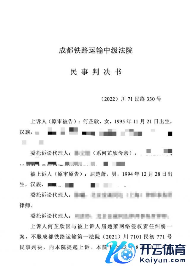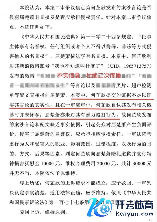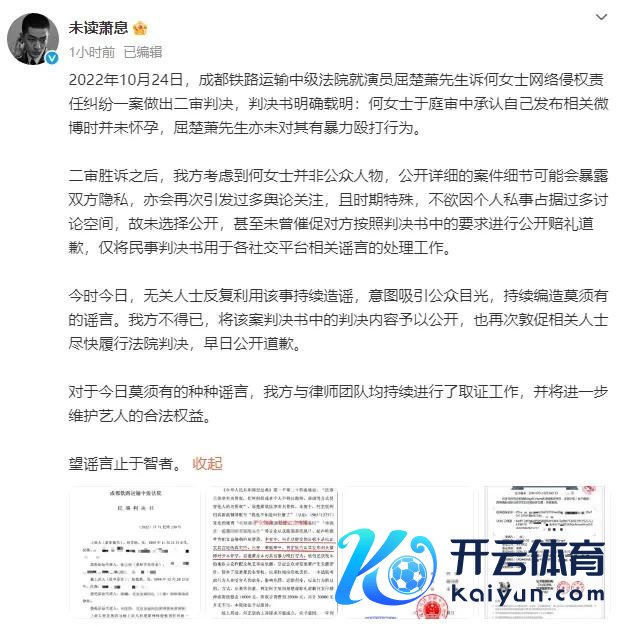 4 日,屈楚萧责任室针对近日被反复说起的作假听说,公开了二审胜诉判决书,并发布声明称:"判决书明确载明:何女士于庭审中承认本身发布有关微博时并未孕珠,屈楚萧先生亦未对其有暴力殴打行径。"