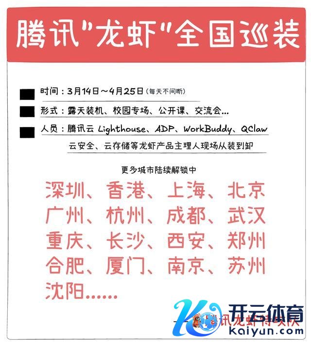 腾讯云文告“龙虾”寰宇免费装配酌量负责启动,3 月 14 日至 4 月 25 日将在北上广深等 17 个城市提供一站式事业。步履时期,时刻群众将现场联结 OpenClaw 部署、妙技装配等,还有“腾讯公司楼下免费装配”限时返场。此外,AI 百校行“高校龙虾专列”也将同步开启。