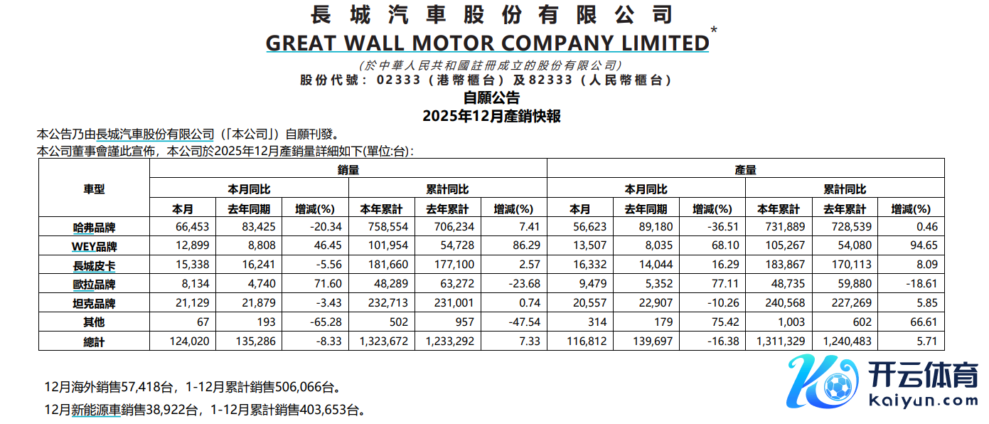 长城汽车:2025年汽车销量为132.4万辆开yun体育网,同比增长7.33%长城汽车:2025年汽车销量为132.4万辆,同比增长7.33%
