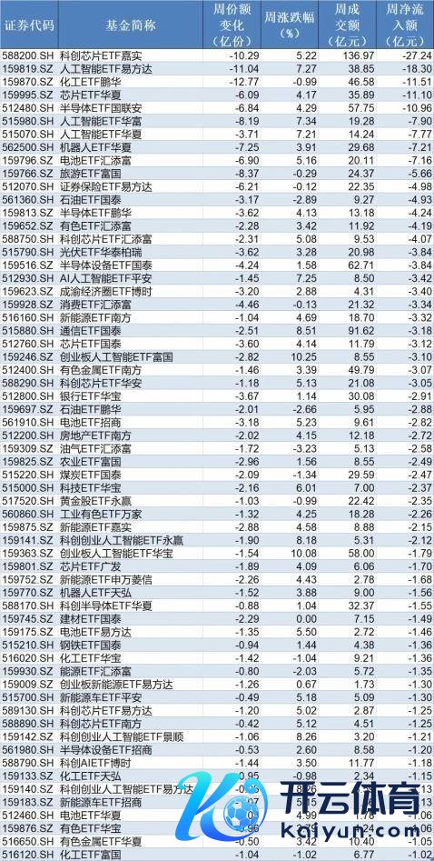 在资金流出方面,本周有62只行业主题ETF净流出逾1亿元,其中科创芯片ETF嘉实、东说念主工智能ETF易方达、化工ETF鹏华份额分离减少10.29亿份、11.04亿份和12.77亿份,分离净流出资金27.24亿元、18.3亿元和11.51亿元。