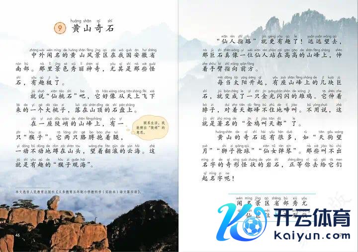 其中写阿里山的课文,皆离不开阿里山的天气的多变性,尤其是阿里山的雨、雾以及随之栽培的云海、日出等等。如实是阿里山与国内除了黄山之外的其他名山比较不相似的方位,然而日出云海这类景不雅的赏玩和描画条目显豁更高。而写黄山的课文《黄山奇石》也在二年事,况且是一篇功能性很强的课文,以黄山的怪石这种二年事孩子比较容易理会的景不雅,以同龄孩子可理会和学习的用词用句成文。相对淡化云海和迎客松这类更寰球纯熟的黄山景不雅。