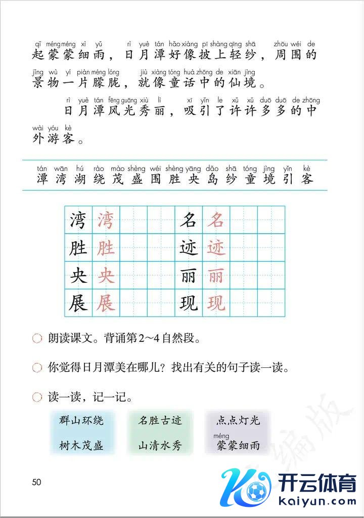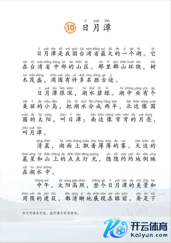 其中《日月潭》是二年事的一篇课文,这个阶段的语文讲义是全注音的。内容相称纯粹,独一两百来字,站在成年东谈主的眼神来看毫无文学性可言,然而因为够短,且从字文句段的角度来说相称相宜二年事学生的生字读写以及全文理会智力。比如基本的比方句和形容词,描画详略关系、由远及近、时辰顺序等等基本的阅读行文逻辑。为接下来的写稿素养作念铺垫。